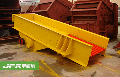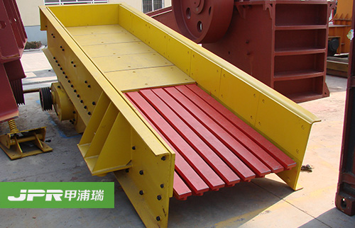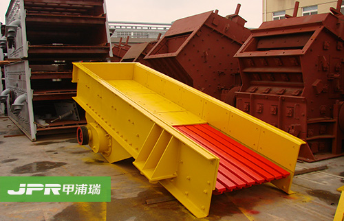 振動給料機在砂石生產線中可為破碎機連續(xù)均勻地喂料避免破碎機受料口的堵塞。振動給料機機是利用振動器中的偏心塊旋轉產生離心力,使篩廂、振動器等可動部分作強制的連續(xù)的圓或近似圓的運動。物料則隨篩廂在傾斜的篩面上作連續(xù)的拋擲運動,并連續(xù)均勻地將物料送至受料口內。